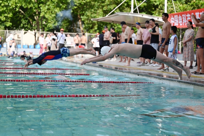 隨著裁判發(fā)令槍響起,選手們躍入水中,水面瞬間激起千層浪花。入水、劃水、吸氣、呼氣,選手在游泳賽道內(nèi)你追我趕,賽場邊加油聲、歡呼聲不斷,碧浪翻滾,賽場內(nèi)輪番上演著速度與激情。經(jīng)過一上午的角逐,6個單項和3個團體項目的職工比賽全部完成。