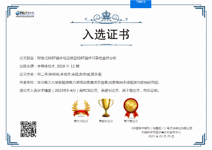 1 焊接式IGBT模塊與壓接型IGBT器件可靠性差異分析 鄧二平,張經(jīng)緯,李堯圣,金銳,趙志斌,黃永章 高被引,高下載,高PCSI