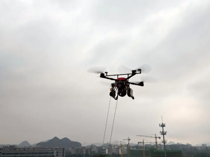 “我這邊準(zhǔn)備好了,可以起飛了!”一聲令下,停放在相距數(shù)十公里的兩端試驗(yàn)點(diǎn)上的系留無(wú)人機(jī)同時(shí)起飛,在駕駛員全神貫注地操作下,無(wú)人機(jī)緩緩升空,并平穩(wěn)地懸停在上方數(shù)十米處。