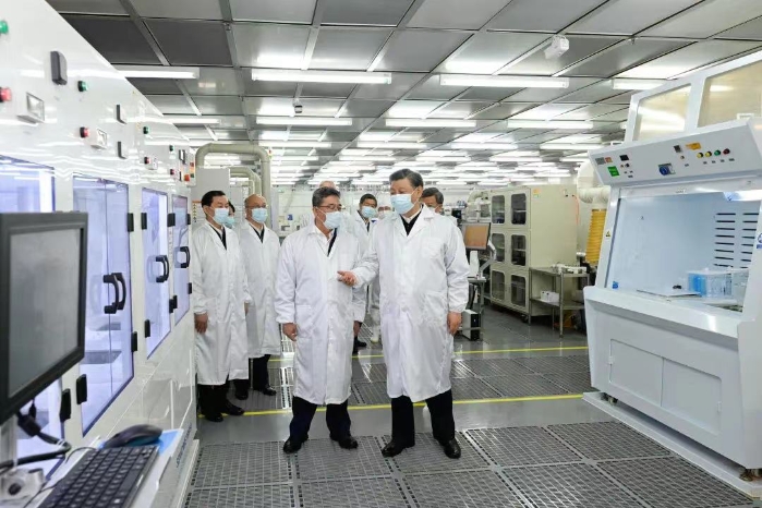 追隨總書(shū)記的腳步走進(jìn)中國(guó)電科產(chǎn)業(yè)基礎(chǔ)研究院芯片技術(shù)研究所,一層展廳正中位置的藍(lán)色展板上,“面向世界科技前沿”“面向經(jīng)濟(jì)主戰(zhàn)場(chǎng)”“面向國(guó)家重大需求”“面向人民生命健康”32個(gè)大字引人注目?!翱倳?shū)記一進(jìn)來(lái)就看到了這塊展板上的內(nèi)容,他叮囑我們要堅(jiān)持‘四個(gè)面向’?!被叵肫鹂倳?shū)記來(lái)時(shí)的情景,中國(guó)電科產(chǎn)業(yè)基礎(chǔ)研究院院長(zhǎng)卜愛(ài)民仍激動(dòng)不已。